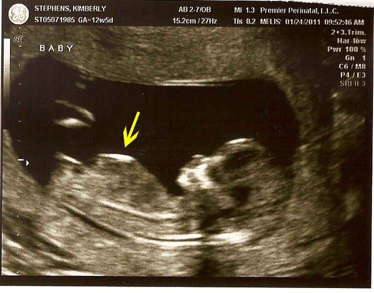 Normally a baby’s organs develop faster than their the body has room for, so God made it so the organs develop outside the body at first, then go through the umbilical cord into the belly at about week 10. By the time 11 weeks roll around, they should already be through, and the hernia they pass through should already have healed. When the doctor looked at our baby, he saw what looked like organs still developing on the outside of its belly (see the arrow in the picture, it’s the cloudy part next to the tube-y looking thing). The term for this issue is Gastroschisis. It’s a birth defect in which an infant’s intestines stick out of the body through a defect on one side of the umbilical chord. It’s not a life-threatening defect. It is usually taken care of by giving birth through C-section and immediate surgery. We would have to wait a few months to take our baby home.