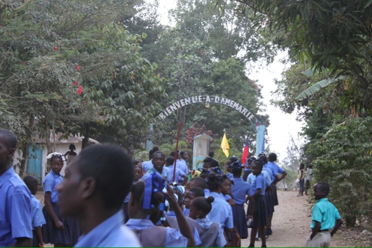 Before I get to today, I first need to tell you about our arrival here yesterday. As we drove down the steep mountain path to the costal town, we were greeted at the entrance by a hoard of people. They had drums and were singing. We got out of the cars and were immediately mobbed by men shaking hands and women leaning in to kiss our cheeks. Each one with a cheery “bonswa!” (meaning-good evening). Then they lead us through the streets singing at the top of their lungs, the great parade snaked through the town until we arrived at the church. The streets were lined with people curious to see what all the noise was about. It was about family welcoming home their siblings. Though many of us had never visited Dame-Marie before, we walked into town like we were long lost friends. I was uncomfortable.