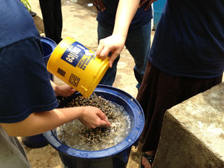 Today we really got into a rhythm with the water filters. Each is a blue cylindrical container about 4ft. high and 12 inches in diameter. We prepare the filters before we go out into the village. First, we put the pieces together, and then we take the strainer that sits on top and run water over the gravel and pour that into the bottom. Next comes finer stone that is washed and poured on top of the gravel. Then we pour 2 gallons of water on top and it is ready to go.